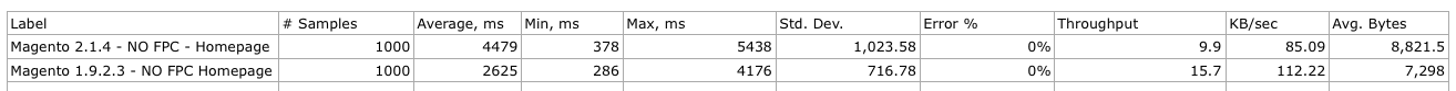 First we will test with Magento 2.1 Full Page Cache (FPC) off. I want to make 1.9 and 2.1 even because Magento CE 1.9.x doesn't have FPC by default.